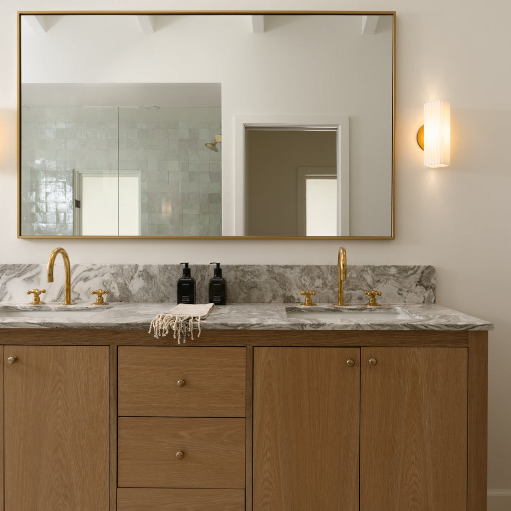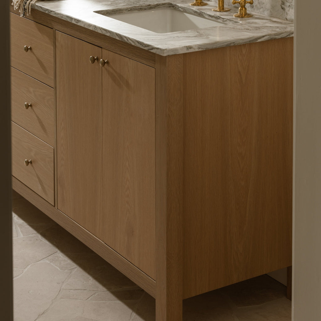 Introducing a new take on our classic London Vanity, the Leandro Vanity offers a minimal design style with its slab doors and drawers, seamlessly blending into your home. The Leandro Vanity includes three drawers in the middle and two french style doors on either side of the unit for maximum storage.