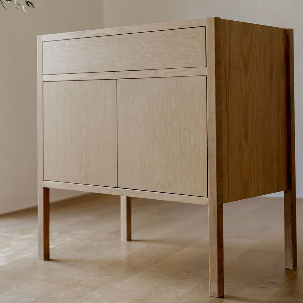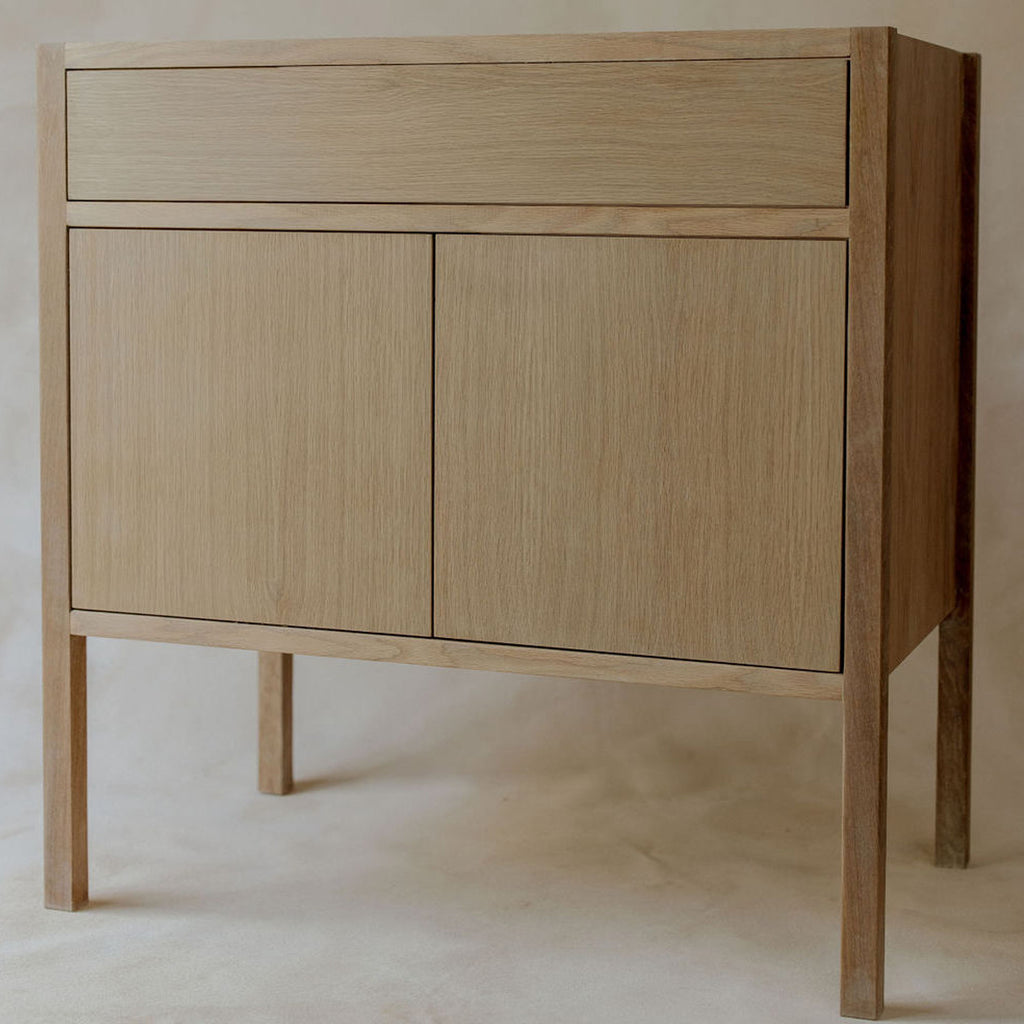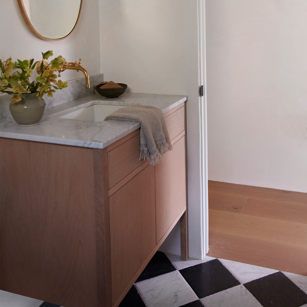 Our Oliver single-sink Vanity offers an elegant yet simple design. Its white oak finish and natural complexion makes a serene statement for your powder room; providing an aesthetic that is easy to incorporate into your new or existing space. Two french style doors open up to the interior of the vanity for storage purposes.