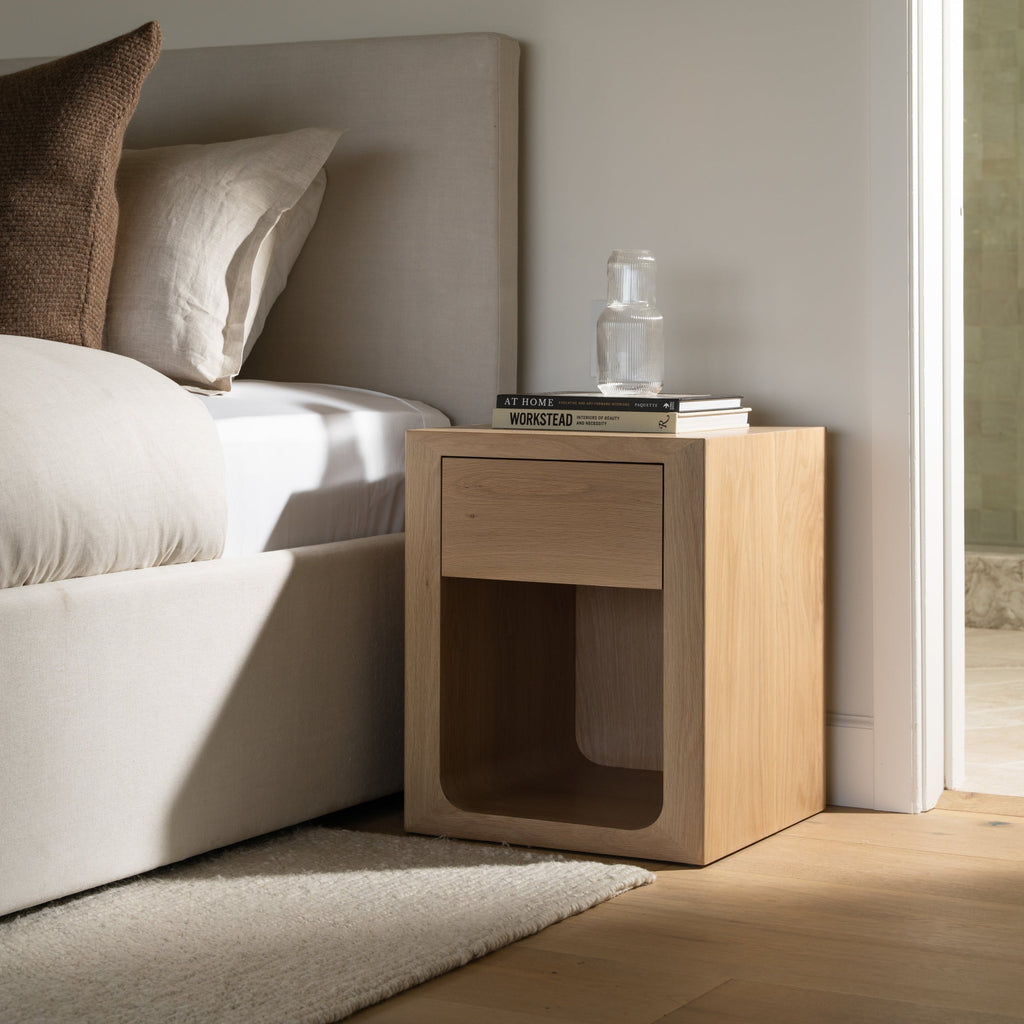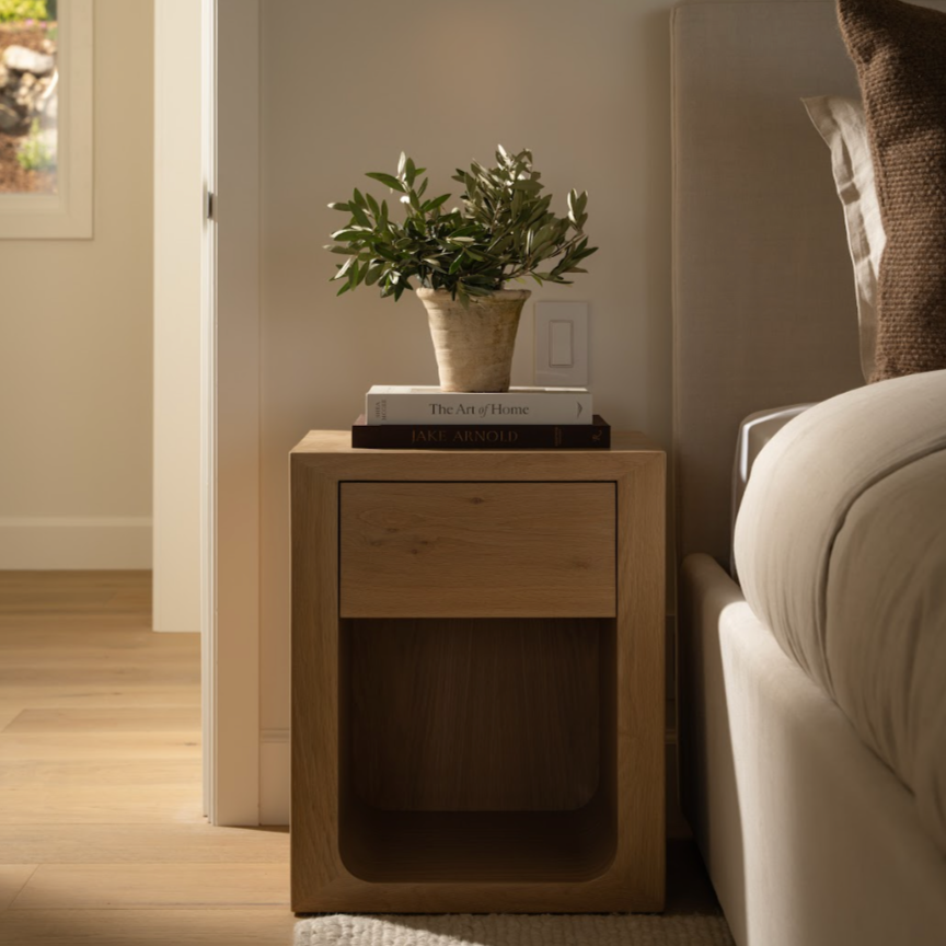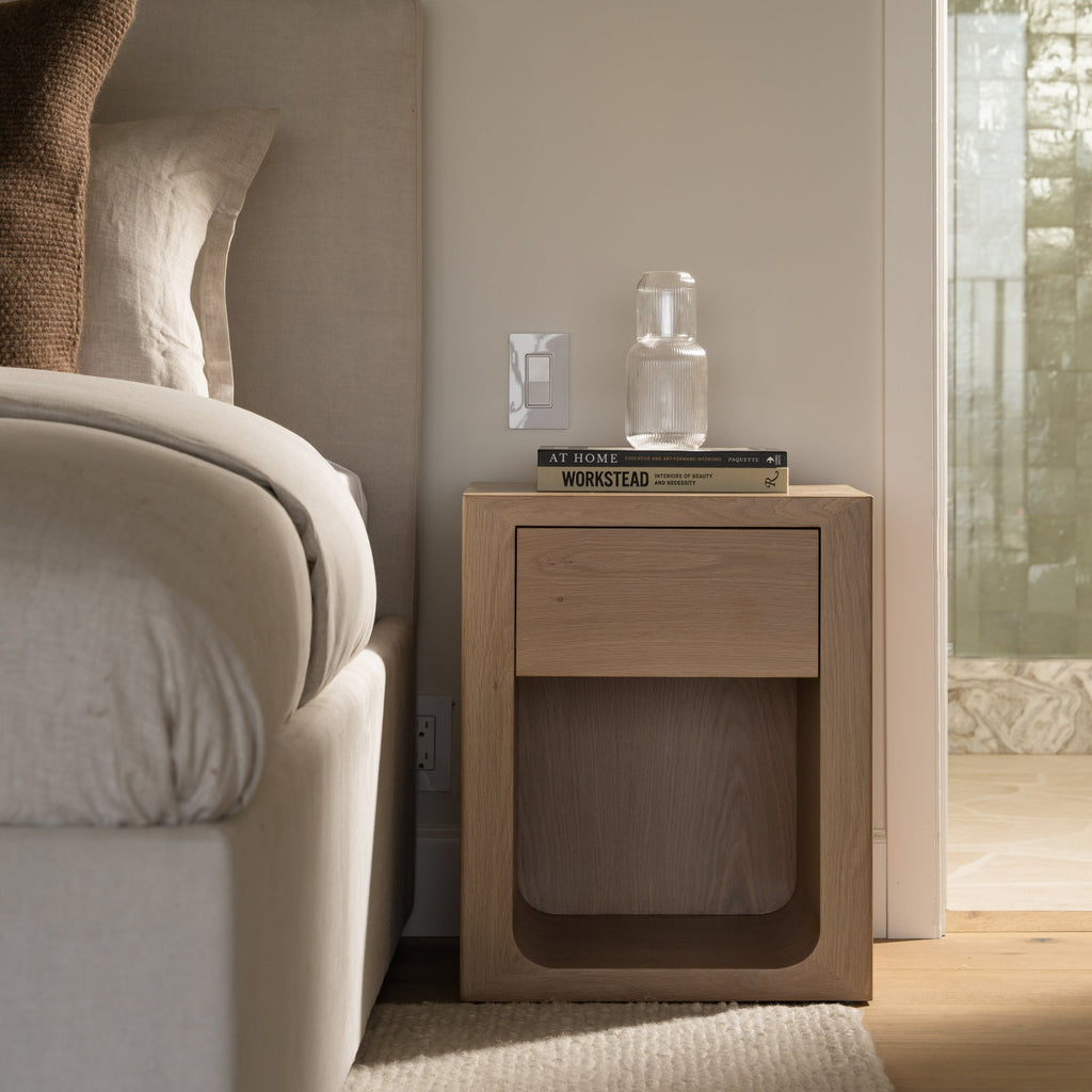 Our Paloma Nightstand is a streamlined yet stunning style, featuring a rectangular frame with a storage drawer and a lower shelf hugged by soft curves.